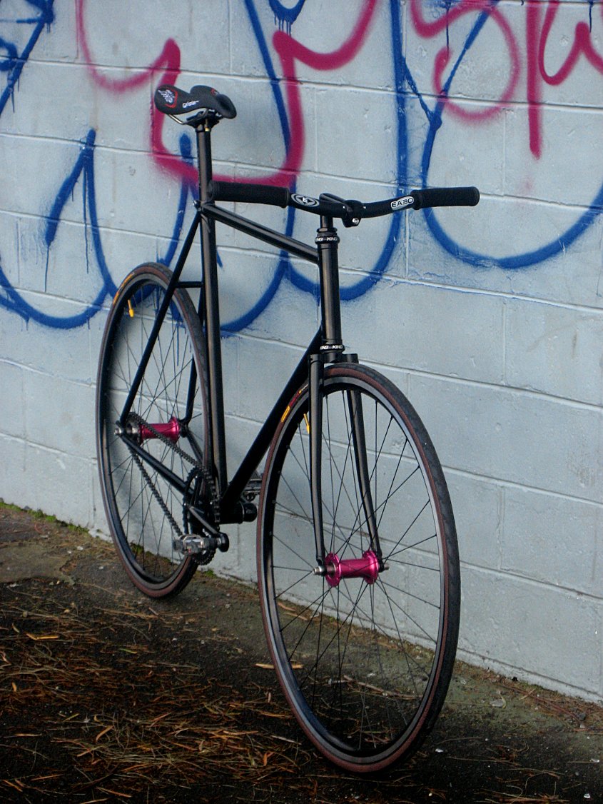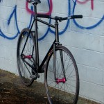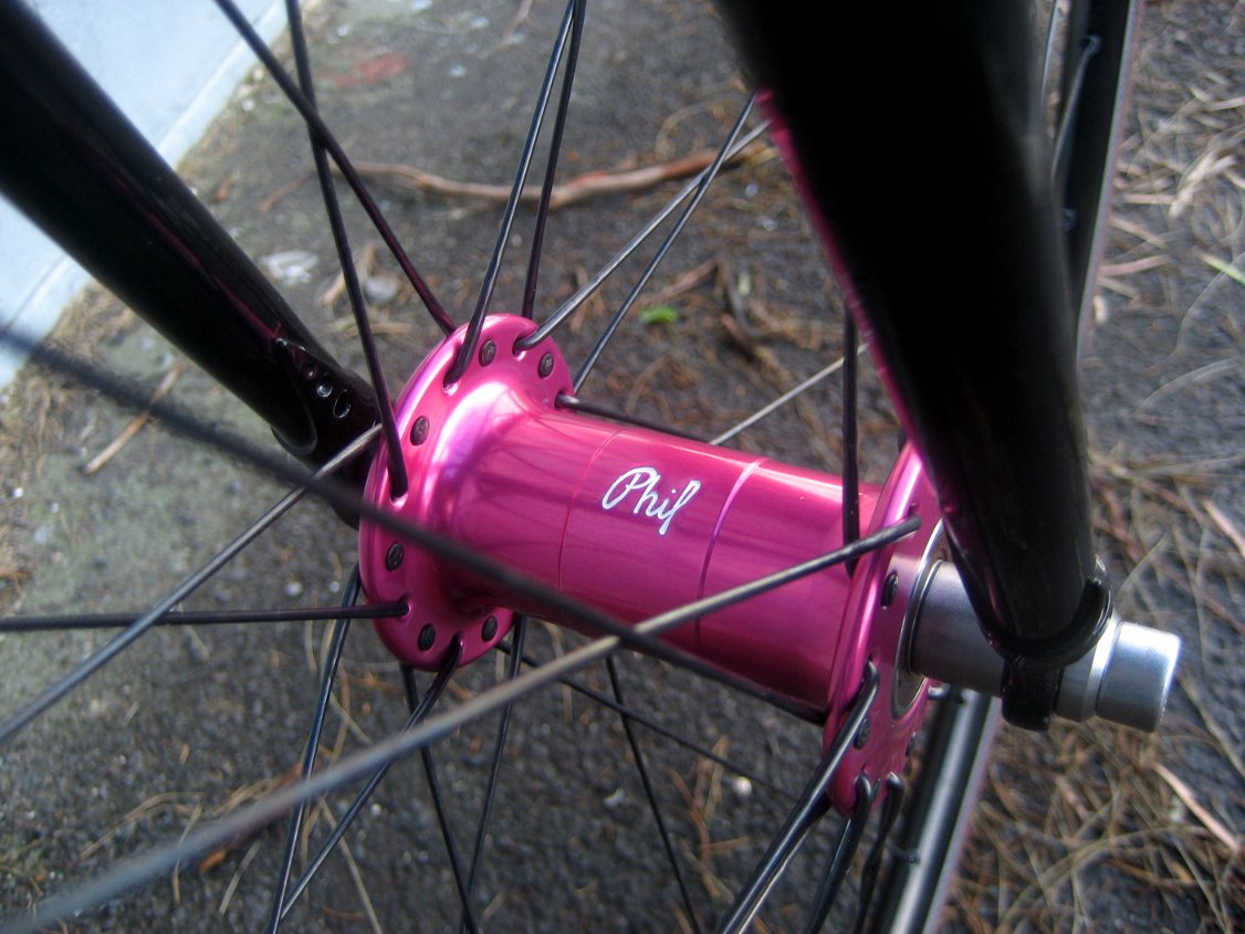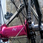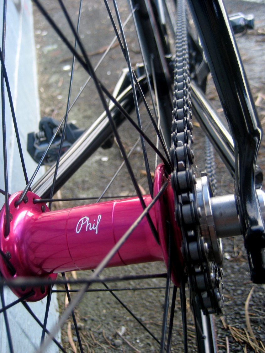 From there, things went a little crazy. Phil came along for the ride, in a potentially controversial colour. Nic and Ben have always maintained that those who spend too much time concerned with aesthetics will end up matching their hubs to their panties. Fortunately, I’m yet to own any underwear that matches this pair, although the rest of the bike follows a theme that is frequently echoed on the coathangers. Either way, fixed gear bikes are sexy, and so are pink hubs.