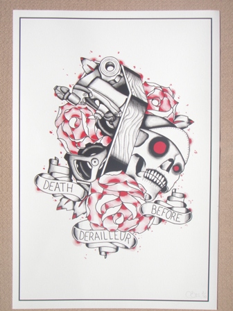 From there, things went a little crazy. Phil came along for the ride, in a potentially controversial colour. Nic and Ben have always maintained that those who spend too much time concerned with aesthetics will end up matching their hubs to their panties. Fortunately, I’m yet to own any underwear that matches this pair, although the rest of the bike follows a theme that is frequently echoed on the coathangers. Either way, fixed gear bikes are sexy, and so are pink hubs.