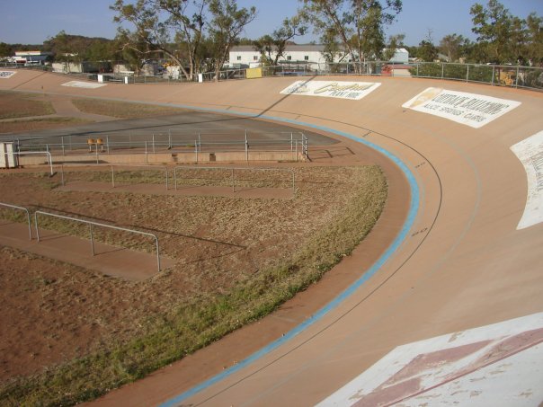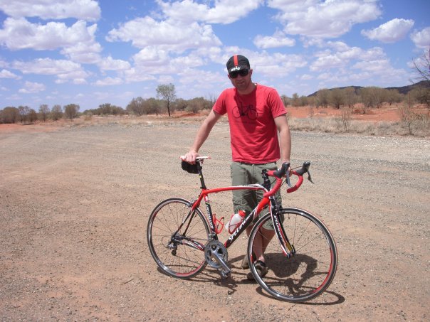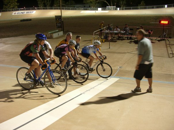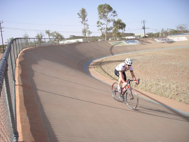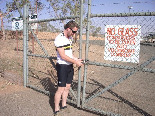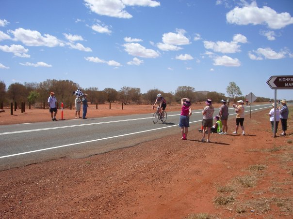 Alice Springs Masters Games Track Carnival was held this past friday night. A strong field of competitors from around the country had turned up to battle it out on the town’s 333meter, 37 degree banked velodrome. One old fella rode all the way from his home in Western Australia to be there (at the expense of his martial status!). B’n’C was limited to sideline action due to not meeting the age requirements.. 🙁 ..but, the very next day was the Alice Springs Cycling Club’s ‘King of the Mountains’ event in which we had an opportunity to vent the pent up white line fever that has been building up in Yulara for the past 3 months…