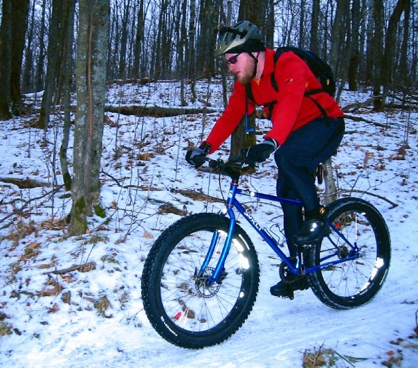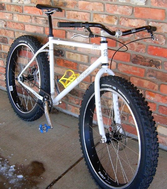 Sand is fkn hard to ride in. No two ways about it. I’ve tried dropping the tyre pressure in my 2.1 Kenda Nevegals to between 17 and 20 psi and even with the increase tyre bag it’s still fkn hard work peddling over sand. Frustration set in after my last training ride and I decided to come home and do some research on the net.. The Surly 1×1 has massive tyre clearance which got me to thinking ‘how big a tyre could I run?’… A quick hunt about on Google presented the above image ^^^ a Surly 1×1 Minnesota ‘Snow Bike’. The Minnesota locals have to suffer snow for months and months on end and have adapted their bikes to suit the local conditions. These fellas use the Surly ‘large marge’ rim (65mm wide) with Nokian 3.0 tyres to ‘float’ over the snow. To fit these huge wheels they cut off the v-brake lugs to improve clearance in the fork arch and rear stays. This might be a tad more extreme solution than I was looking for but I’m thinking about trying a wider rim and maybe using my old DH tyres, the 2.7 Maxxis Minions to see if I can get anymore float. Might also experiment with Sammies 650b wheelset..