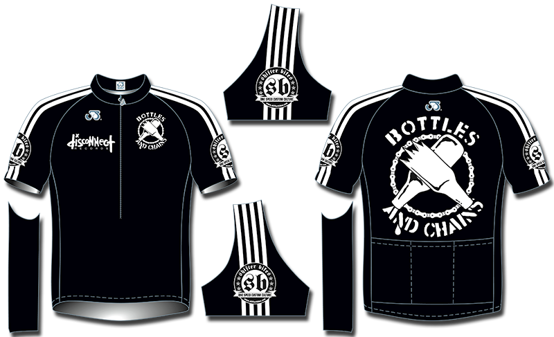 The thumbnail images I’ve attached are the first two mock-ups of the jersey. The final design is being drawn up tomorrow, being a blend of these two versions. The final design will have the large B’n’C logo on the back, a Shifterbikes logo on either arm, a B’n’C logo on the left brest, the Disconnect Records logo on the right brest and the B’n’C wording up the side panels without the bottles and bike chain image.